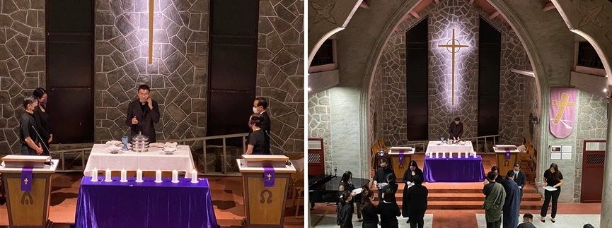 4月1日(四)學校舉行聖餐設立禮拜,重演耶穌在設立聖餐到祂受難的情景,賴弘專老師主理。聖餐後的暗影禮拜,一段經文、一個描述、一根一根的蠟燭被熄滅,講台上的物件一個一個被搬走,最後在十架上掛上黑紗,現場泣不成聲,耶穌為我們的罪死在十字架上。透過禮拜再一次體會十架寶血之愛,也預備心迎接即將來臨的主復活。