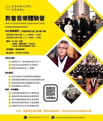 10/13~14 渴望在音樂事奉的道路上更進深嗎?本校將舉辦「教會音樂體驗營」,誠摯邀請對教會音樂懷有熱忱的您前來參與。兩天的營會中,將由師長帶領,內容涵蓋神學與崇拜工作坊、合唱指揮與敬拜團實作演練。這不僅是音樂技巧的提升,更是奠定信仰根基、探尋未來事奉道路的深度旅程。無論您是教牧同工、詩班或敬拜團成員,或是對此領域充滿理想的學生,都歡迎您前來交流學習,一同看見自己在音樂事奉中的呼召與可能。 |