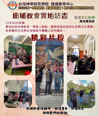 神學系《聖靈與祖靈:跨文化神學的探索之旅》課程周成輝老師帶領學生從課堂走入田野。10月25日,前往新竹尖石鄉田埔部落進行實地訪查,延續上學期「隨神心意的風──與聖靈同行再思原住民宣教事工」的學習脈絡,並以《山間靈風吹起:泰雅爾的甦醒》一書為啟發。當日由田埔教會師母、教會長老與部落耆老熱情接待,介紹教會在社區中的服事與信仰旅程,並分享泰雅族文化與信仰變遷的故事。透過真實的對話與現地觀察,展現出信仰在文化交會處的樣貌。從課堂理論到田野實踐,這是一場充滿啟發的學習旅程,讓人更深體會聖靈的奇妙作為。