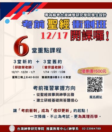 本課程為期六週,專為考前衝刺設計,帶領學員在有限時間內迅速掌握聖經的整體架構與神學核心。透過系統化的引導與重點整理,提升答題與應試能力。 |