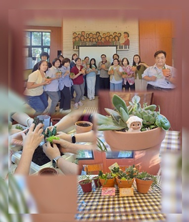 這次行政同工教育訓練邀請園藝治療師史維慈老師帶來《來盆肉多多》園藝療育工作坊,讓大家放下公文、拿起鏟子,親手打造屬於自己的多肉小森林。史老師從「什麼是好土?」談起,介紹不同介質的特性,也教大家依照性格與環境調配最適合的土壤比例——愛澆水的要透氣、健忘型要保水。老師的教學,讓我們從植物身上,體會到生命的靈性。實作時,大家專心換土、修剪、佈置,每一盆多肉都帶著主人的巧思。短短一個下午,從泥土的香氣到綠意的陪伴,每個人都在過程中互相欣賞彼此的盆栽,笑聲此起彼落,學到了綠手指的技術,和同事間不一樣的交流,也讓心稍微鬆了一下。
