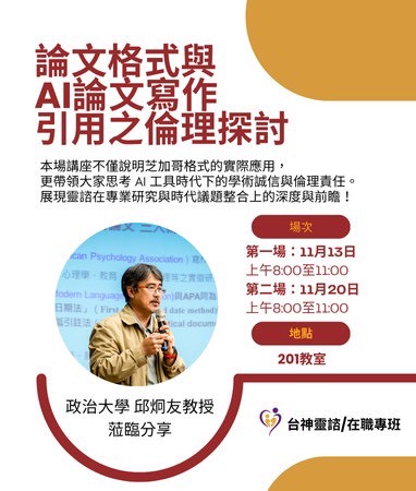 靈諮關心學術專業與時代議題,11/13(四)與11/20(四)邀請國立政治大學圖書資訊與檔案學研究所邱炯友教授蒞校,於8:00–11:00在台神201教室主講「論文格式與AI論文寫作引用之倫理探討」。本系列講座除強化同學對芝加哥格式的應用外,也引導大家思考AI工具運用下的學術誠信與倫理責任,展現靈諮在專業研究與時代議題整合上的用心與前瞻。