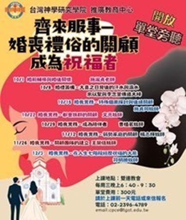 「齊來服事:婚喪禮俗的關顧」本課程特別為教會長老、執事及關懷同工設計,帶領學員深入探討台灣婚喪禮俗與基督信仰的交會處境,幫助您成為有智慧的陪伴者與祝福者。課程內容涵蓋婚喪禮俗的文化意涵、聖經基礎、教會實務操作,以及溝通、情感支持與屬靈關懷的技巧,並探討如何面對傳統習俗與信仰張力,協助教會建立具系統的關懷團隊。 |