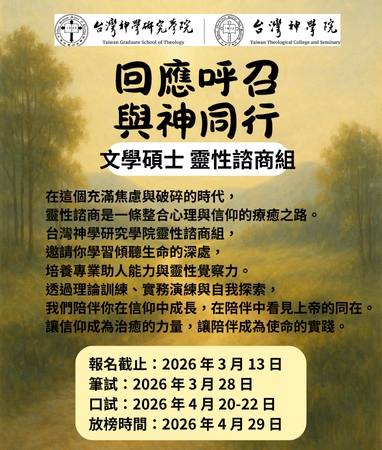 在這個充滿焦慮與破碎的時代,靈性諮商是一條整合心理與信仰的療癒之路。台灣神學研究學院靈性諮商組,邀請你學習傾聽生命的深處,培養專業助人能力與靈性覺察力。透過理論訓練、實務演練與自我探索,我們陪伴你在信仰中成長,在陪伴中看見上帝的同在。