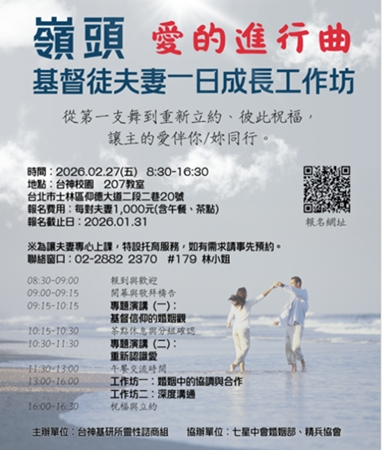 夫妻關係是家庭最核心的連結,也是彼此生命成長的重要祝福。靈諮將於明年舉辦 「基督徒夫妻一日成長工作坊」,透過專題、實務工作坊與彼此分享,陪伴夫妻重新對焦關係、恢復溝通、彼此支持,更多經驗從神而來的愛與更新。邀請您們預備心,一同投注一天的時間在彼此身上,再次在主裡建造穩固而喜樂的關係。期待與您們同行這段美好的成長旅程!
