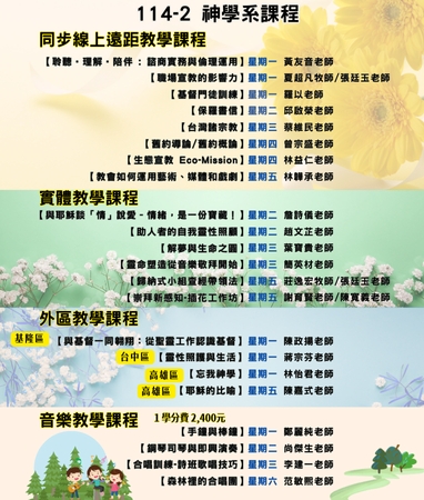 推廣教育中心與教會領袖學院,是您生命成長的同行者,也是教會培育下一世代的堅實幫助。我們深信,每位踏入課室的學員,都將在學習中看見更廣闊的信仰、在思考中遇見上帝、在事奉中辨識呼召,並在群體中領受恩典。我們的目標是引導信徒在信仰與生命上成熟、深刻,同心建造合乎主心意的教會,使福音在台灣各地扎根並結出豐盛果實。雖然 114-2 學期新課程尚未開放報名,但誠摯邀請您,現在就預備心選課!本學期將推出一系列全新的精彩課程,引導您更深委身於真理與使命。