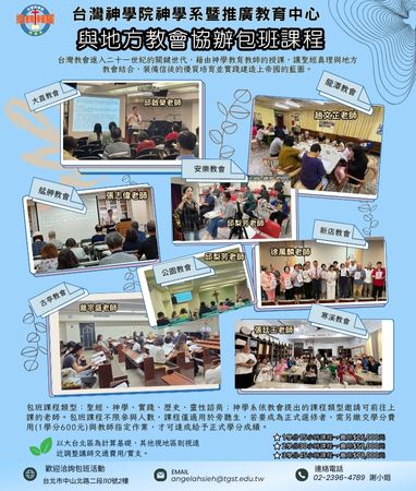 神學教育走進教會 神學系包班課程 讓神學資源成為教會成長的雙翼!神學系致力於打破校園與地方教會的藩籬,由資深師資走出教室,為您的教會量身規劃專業且紮實的課程。無論是聖經深造、領袖培育或家庭關係,我們都能針對教會牧養的實際需求精準對接。 這不僅是知識的傳授,更是一場在熟悉的環境中發生的靈命重整。透過與老師面對面提問、學員間的生命激盪,我們將與您攜手,在地方教會內打造專屬的屬靈成長平台,為教會事工注入嶄新活力。 歡迎洽詢02-2396-4789 謝姊妹 一同推動信仰造就與教會更新! |