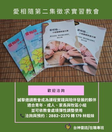 愛相隨第二集 徵求實習教會 《愛相隨 第二集》從第一集的情緒陪伴出發,進一步陪伴參與者認識自己、建立關係,並在信仰中探索存在與生命意義。課程內容涵蓋自我認識、興趣與恩賜、價值觀與性格特色,也觸及友誼、愛情、溝通與決策等關係議題,並透過同在、傾聽、同理與覺察,帶領群體走過助人歷程,學習更真實的同行。 現正徵求《愛相隨 第二集》實習教會,誠摯邀請教會成為課程實踐與陪伴發展的夥伴,適合青年、成人、家長與牧區小組,並可依教會處境彈性調整使用。 📞 洽詢與預約:2882-2370 轉 179 林姐妹 |