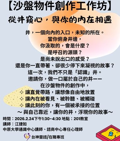 【沙盤物件創作工作坊】 從井窺心,與你的內在相遇 2/24下午1:30-4:30 井,一個向內的入口,未知的所在。 當你俯身井邊,你汲取的,會是什麼? 是呼召的源頭?是尚未說出口的感受? 還是你一直帶著卻很少停下來凝視的故事? 這一次,我們不只是「認識」井。 邀請你,做一口屬於自己的井—— 在沙盤物件的創作中, ✧ 讓直覺帶路,讓想像自由地放置 ✧ 讓內在被看見、被聆聽、被觸碰 ✧ 讓此刻的你,有一個被承接的位置 ~ 與自己靠近,讓你的井,浮現你的故事~ 講師:江捷如 中原大學通識中心講師 諮商中心專任心理師 |