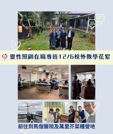 在職專班校外教學花絮 12/6 台神在職專班修讀末期病人靈性照顧的同學們在胡蓮芬老師的帶領下,一行人前往馬偕醫院淡水院區參觀安寧療護教育示範中心,聆聽張軒愷牧師的分享,同學們都收獲滿滿。隨即修習宗教靈性專題的同學到芥菜種會萬里營地參訪。參訪過程中有丁帥之主任分享信仰實踐在社區工作,也有中區助人網培育副處長凱妮督導介紹芥菜種的事工,同學們深刻體會到基督宗教的靈性關懷實務工作如何展現在靈修生活與落實在弱勢族群的社會工作中。同學們透過實地參訪活動更深刻體驗靈性關懷的工作,都表示敬佩第一線的牧者與專業人士,願神祝福。 |