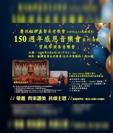 本校尚傑生老師受邀參與艋舺長老教會150週年感恩活動,本次將彈奏堂內著名的Klais管風琴,演繹韓德爾、巴赫、孟德爾頌及魏多等大師名作,並有聖詩即興帶領會眾齊唱。特別的是,他更將〈高山青〉、〈安平追想曲〉等台灣民謠改編為管風琴版,並以一曲〈恭喜〉為教會獻上祝賀,共證一個半世紀的恩典。 時間:3/8 14:30 地點:艋舺長老教會(貴陽街二段94號)。 敬邀齊來聆賞! 3/15日下午3:00另有感恩音樂會 邀請大稻埕、淡水、東門、南門教會聖歌隊,以及華盛頓大學指揮博士戴宇音指揮艋舺教會聖歌隊與室內樂團演唱彌賽亞選粹。 |