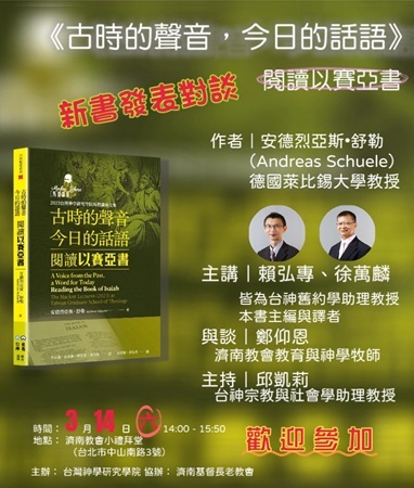 古時的聲音,今日的話語—閱讀以賽亞書 新書發表對談 德國萊比錫大學安德烈亞斯•舒勒(Andreas Schuele)教授,於台神馬偕講座揭示了以賽亞書那「冒著風險的神學」。邀請您乘著此書的洞見,與生命和真理交會,在當今詭譎多變的時代,從先知信仰的眼光重新認識國際局勢 。 時間: 3/14 (六) 14:00 - 15:50 地點: 濟南教會小禮拜堂 (台北市中山南路3號) 主講: 賴弘專、徐萬麟(皆為台神舊約學助理教授/本書主編與譯者) 與談: 鄭仰恩(濟南教會教育與神學牧師) 主持: 邱凱莉(台神宗教與社會學助理教授) 主辦: 台灣神學研究學院 協辦: 濟南基督長老教會 |