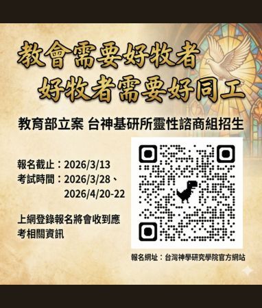 文學碩士靈性諮商組 招生資訊 即日起至3/13 教會需要好牧者、好牧者需要好同工 在多變的世代中,教會需要能傾聽生命、陪伴傷痛、牧養人心的好牧者,而好牧者也需要具備專業裝備與同心同行的好同工。教育部立案「台灣神學研究學院基督教研究所靈性諮商組」致力培育兼具信仰深度與助人專業的服事者,透過靈性關懷、諮商理論與實務整合訓練,裝備學生回應個人、家庭與教會多元需要,成為帶來盼望與陪伴力量的同工。 報名截止:2026/3/13 考試時間:2026/3/28、4/20~22 歡迎有志於牧養與關懷事工的您,一同加入裝備與學習的行列。 |