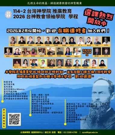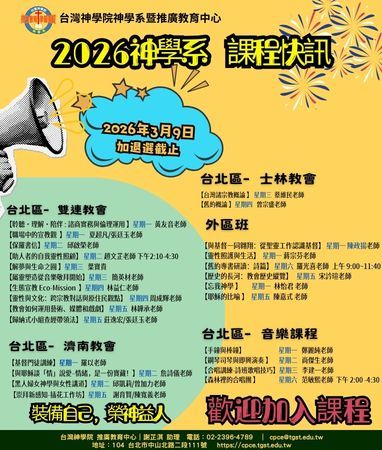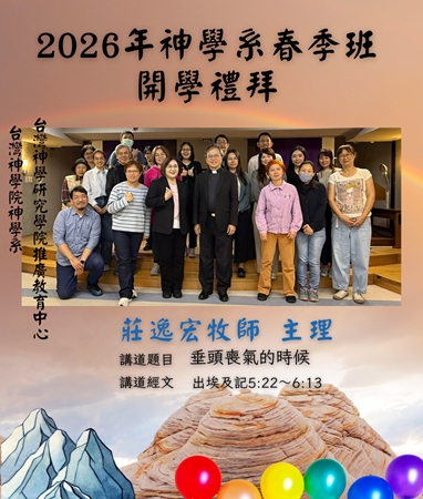 114學年度下學期,神學系開設多樣的課程,誠摯邀請對聖經、神學、教會歷史、諮商輔導、教會音樂以及信仰生活有興趣的弟兄姊妹,一同來上課。無論您是想深入探索聖經的教義與真理、增進對教會歷史的了解,或是想要在諮商輔導與教會音樂方面培養專業能力,這些課程都將為您提供豐富的知識與實踐機會。 我們誠摯歡迎您加入,與我們一起在學習與信仰的旅程中,共同成長。 |