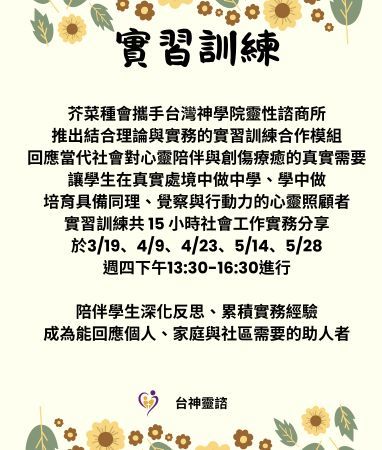 芥菜種會實習訓練 3/19~5/28 芥菜種會攜手台灣神學院靈性諮商所,推出結合理論與實務的實習訓練合作模組,回應當代社會對心靈陪伴與創傷療癒的需求。課程強調「做中學、學中做」,透過案例分享與實務交流,培育具備同理、覺察與行動力的心靈照顧者。實習訓練共15小時社會工作實務分享,分五次於週四進行,邀請第一線專業工作者帶領,陪伴學生深化反思、整合理論與經驗,逐步建立專業視野。期盼透過此合作模組,裝備學生在未來能更有能力回應個人、家庭與社區多元而複雜的需要,成為帶來盼望與陪伴力量的助人者。 |