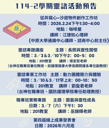 114-2學期靈諮活動預告 2~6月 114-2學期靈性諮商系列活動即將展開,誠摯邀請大家一同參與專業學習與靈性成長。2月24日「從井窺心—沙遊物件創作工作坊」,由江捷如心理師帶領,透過創作與象徵探索內在世界。3月3日與10日舉辦「長照與靈性關懷」專題講座,關注高齡社會中的關懷實務。3月7日「園藝與靈性成長」實務專題,以及3月10日與17日「動力團體簡介與體驗」專業工作坊,提供多元體驗與專業培力。六月底將舉辦第四屆線上成果發表會,呈現學習與實務成果。邀請您在新學期一起深化專業視野,拓展關懷行動力。 |