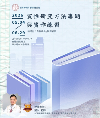 質性研究方法專題與實作練習 5/4~ 6/29 隔週一上課 我們在實際服事現場所面對的複雜處境與真實問題, 透過系統性訓練,如何提問、整理問題、建立架構, 在研究設計與實務應用之間建立有機連結的能力。 授課老師:羅以老師 |