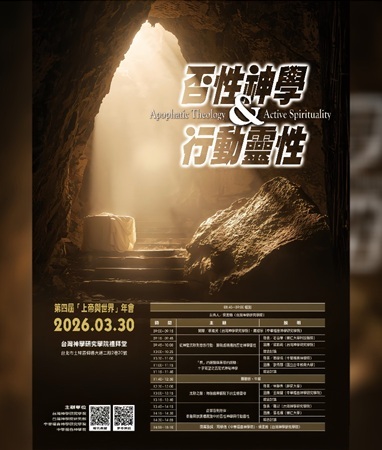 第四屆「上帝與世界」研討會 主題:否性神學與行動靈性 (Apophatic Theology and Active Spirituality) 3/30 否性神學和靈性,讓我們意識到,消極和黑暗的籠罩,不見得就沒有蠢蠢欲動的美善力量。我們如何練習停下來思考,沉澱,我們到底處於一個怎樣的世代,要往何處去? 地點:台灣神學研究學院禮拜堂 報名截止日期:3/16 |